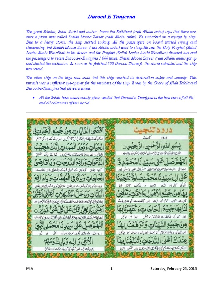 6 Durood E Tunajjina English Arabic Translation And Transliteration - Recitation of darood tanjeena in abundance is a cure for sicknesses and protection against all forms of calamities and misfortunes.in case of any in case of any problem,recite darood e tanjeena 1000 times a day or at least 300 times a day,inshallah u will get out of the trouble miraculously.