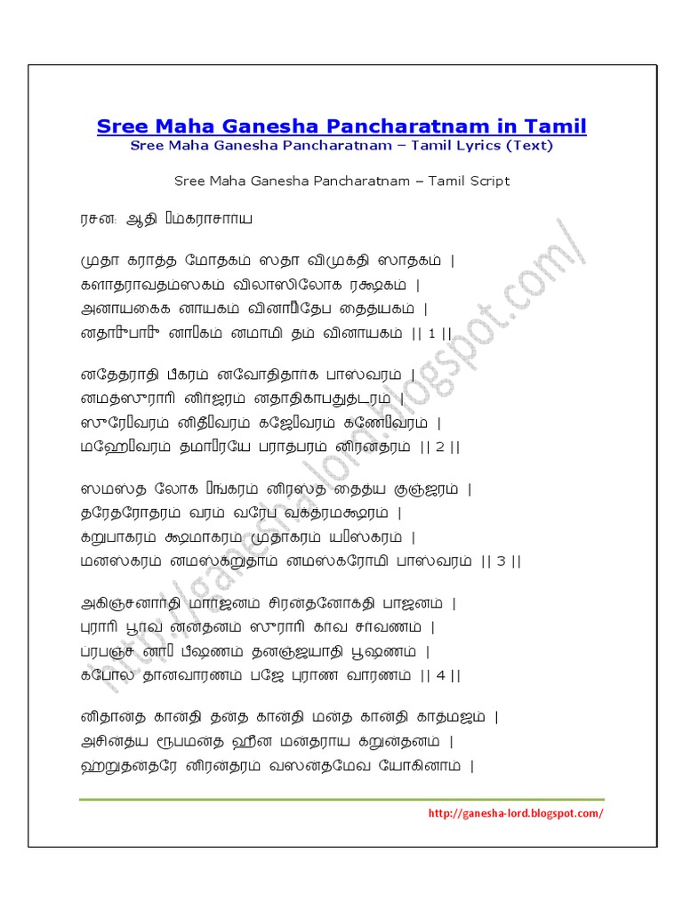 Ganesha Pancharatnam Lyrics In Tamil - Ganesha pancharatnam lyrics in tamil pdf. Ganesha Pancharatnam Lyrics In Tamil : Mudaakaraatha modakam sadaavimukthi saadhakam kalaadaraava tamsakam vilaasiloka rakshakam anaayakaika nayakam vinaasithebha dhaithyakam nathaashubhaashu nasakam namamitham vinayakam (1).