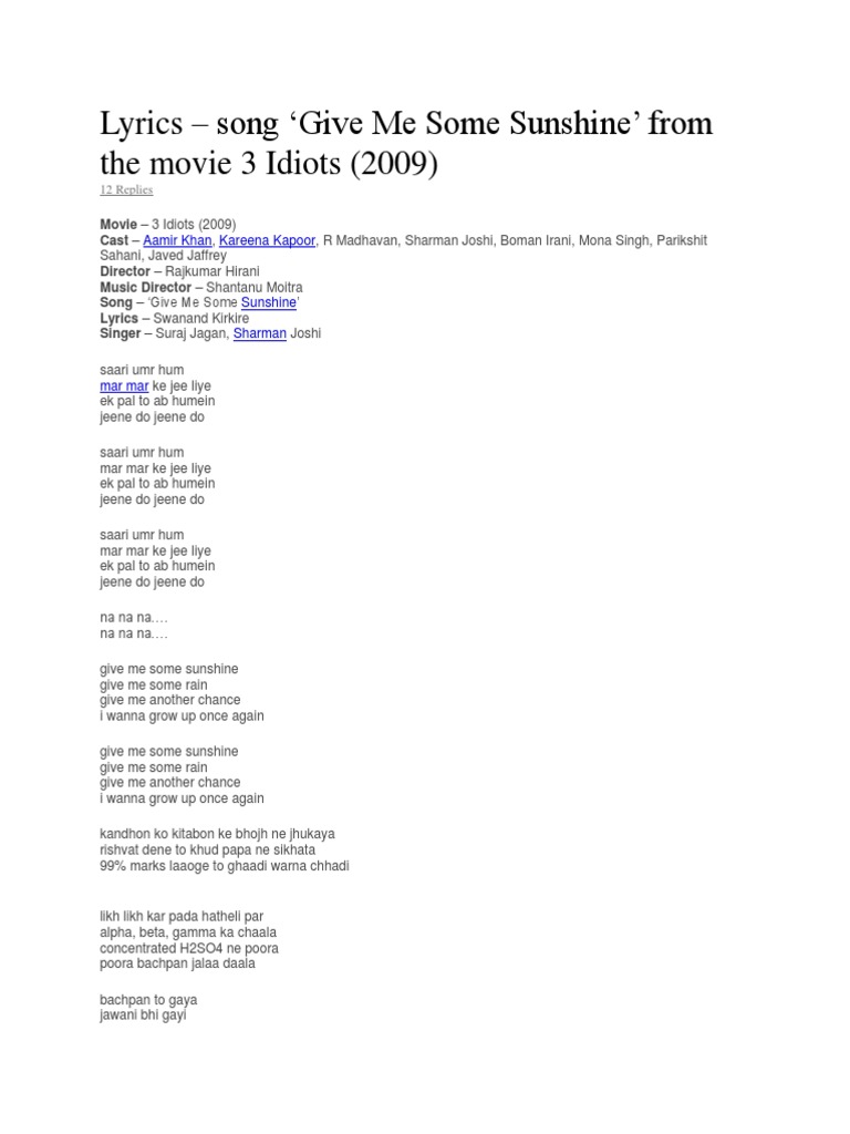 Give Me Some Sunshine Lyrics 3 Idiots Youtube - Sonu nigam, swanand kirkire & shaan give me some sunshine.