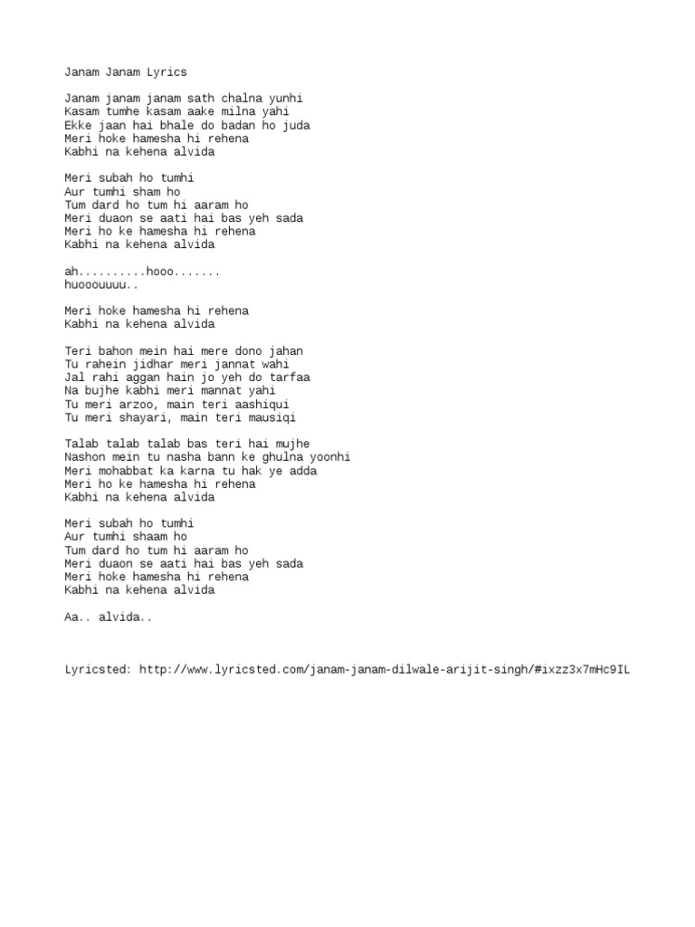 Janam Janam Lyrics Arijit Singh From Dilwale Janam Janam Janam Saath Chalna Yunhi Kasam Tumhe Kasam Aake Milna Yahin Ek Jaan Hai Bha Lyrics Music Songs Songs - Janam janam janam saath chalna yunhi kasam tumhe kasam aake milna yahin ek jaan hai bhale do badan ho judaa meri hoke hamesha hi rehna kabhi na kehna alvida meri subah ho tumhi aur tumhi shaam ho tum dard ho tum hi aaraam ho.