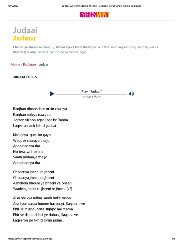 Judai Song Lyrics : Maut na ai, teri yaad kyon ai, lnbi judaai chaar dinon ka pyaar ho rabba, badi lnbi judaai hothhon pe ai meri. Judai Song Lyrics : Maqbool khwaja music label :