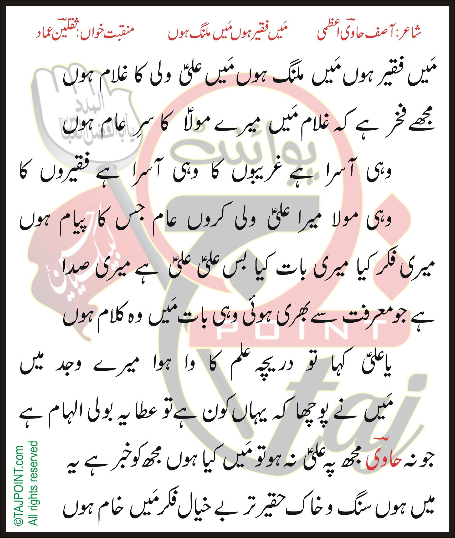 Mai Tu Panjtan Ka Ghulam Hoon Lyrics : Unfortunately we're not authorized to show these lyrics. Mai Tu Panjtan Ka Ghulam Hoon Lyrics - 0 ratings0% found this document useful (0 votes).
