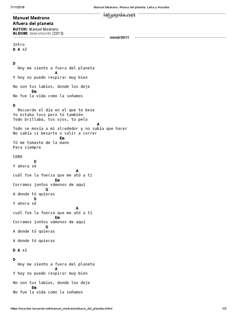 Manuel Medrano Afuera Del Planeta Letra : Chordify is your #1 platform for chords. Manuel Medrano Afuera Del Planeta Letra : Letra de afuera del planeta © warner/chappell music, inc protagonistas:
