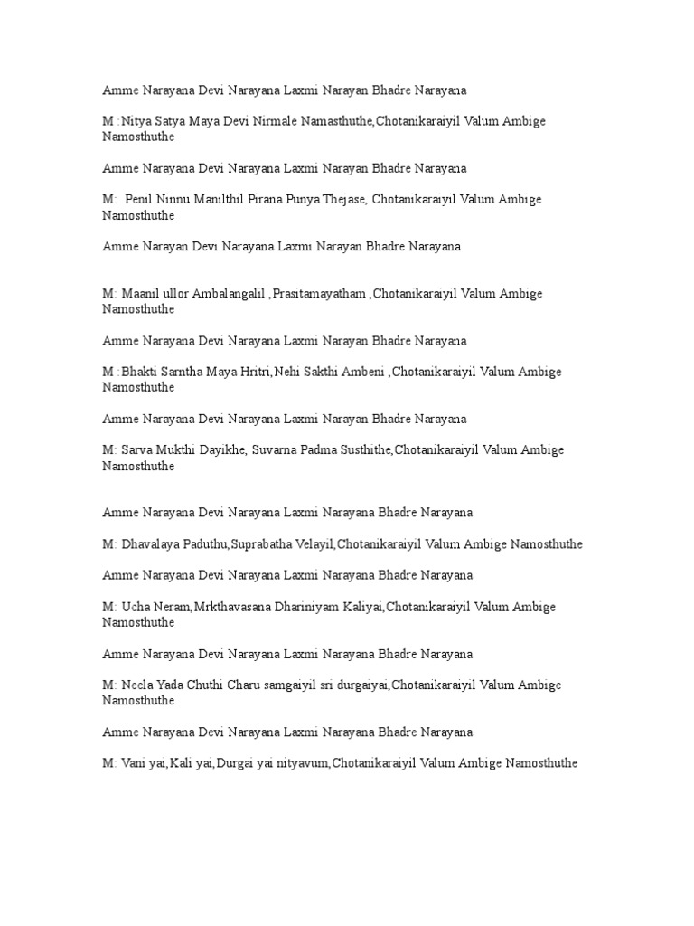 Amme Narayana Devi Narayana Lakshmi Narayana Bhadre Narayana Song Download Downloadmeta - Be the first to add the lyrics and earn points.