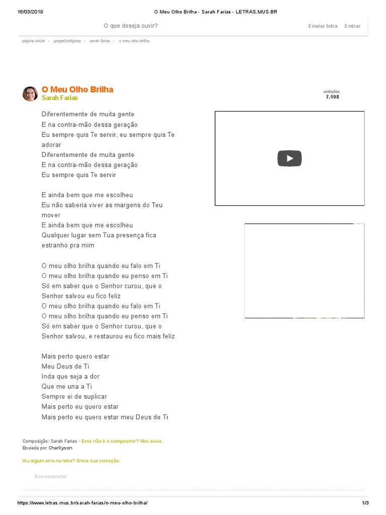 O Meu Olho Brilha Sarah Farias Letras Mus Br Pdf Lazer Entretenimento Geral - Mas mesmo assim me escolheu mas mesmo assim me escolheu porque a gloria e dele e tudo e pra ele e somente ele nao falhara.